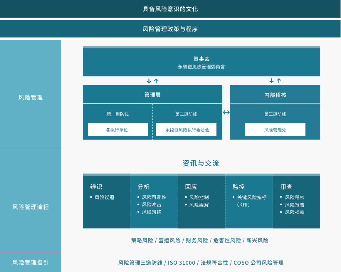 本公司董事会为风险管理最高治理机构,监督风险管理并制定管理政策与程序,并检视风险策略与公司经营策略一致性。风险管理执行成果将每年向董事会汇报。在董事会的指导和监督下,逐步建立企业的风险治理文化。